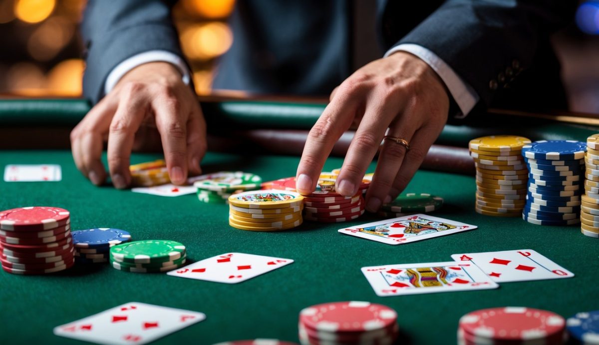 Tangan dealer sedang mengatur kartu dan ubin Pai Gow Poker di meja kasino dengan tumpukan chip taruhan kecil.